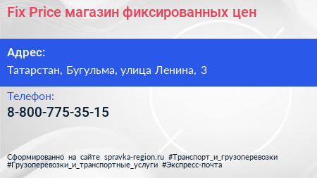 Fix Price, магазин фиксированных цен по адресу Татарстан, Бугульма, улица Ленина, 3 в дальнейшем Организация, размещена в следующих категориях: