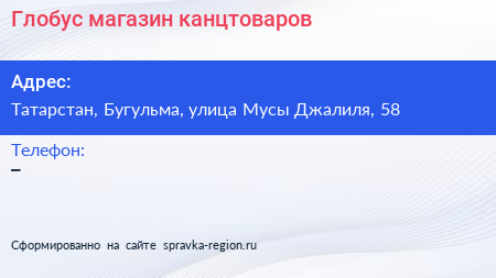 Глобус, магазин канцтоваров по адресу Татарстан, Бугульма, улица Мусы Джалиля, 58 в дальнейшем Организация, размещена в следующих категориях:
