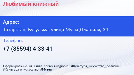 Любимый книжный по адресу Татарстан, Бугульма, улица Мусы Джалиля, 34 в дальнейшем Организация, размещена в следующих категориях: