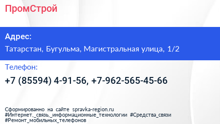 ПромСтрой по адресу Татарстан, Бугульма, Магистральная улица, 1/2 в дальнейшем Организация, размещена в следующих категориях:
