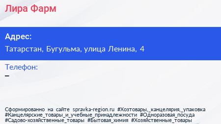 Лира Фарм по адресу Татарстан, Бугульма, улица Ленина, 4 в дальнейшем Организация, размещена в следующих категориях: