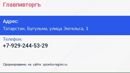 Главпивторгъ по адресу Татарстан, Бугульма, улица Энгельса, 1 в дальнейшем Организация, размещена в следующих категориях: