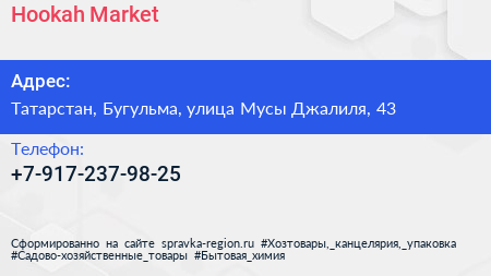 Hookah Market по адресу Татарстан, Бугульма, улица Мусы Джалиля, 43 в дальнейшем Организация, размещена в следующих категориях: