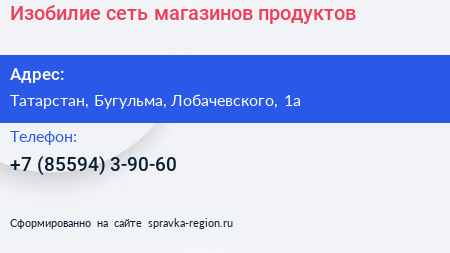 Изобилие, сеть магазинов продуктов по адресу Татарстан, Бугульма, Лобачевского, 1а в дальнейшем Организация, размещена в следующих категориях: