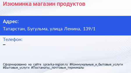 Изюминка, магазин продуктов по адресу Татарстан, Бугульма, улица Ленина, 139/1 в дальнейшем Организация, размещена в следующих категориях: