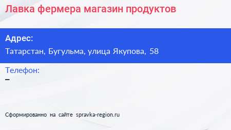 Лавка фермера, магазин продуктов по адресу Татарстан, Бугульма, улица Якупова, 58 в дальнейшем Организация, размещена в следующих категориях: