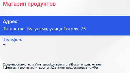 Магазин продуктов по адресу Татарстан, Бугульма, улица Гоголя, 75 в дальнейшем Организация, размещена в следующих категориях: