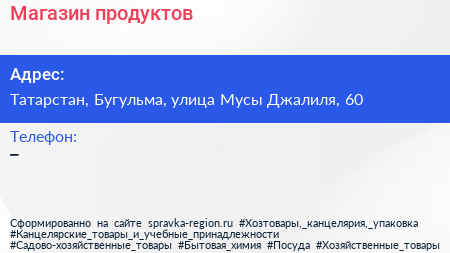 Магазин продуктов по адресу Татарстан, Бугульма, улица Мусы Джалиля, 60 в дальнейшем Организация, размещена в следующих категориях: