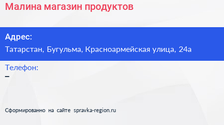 Малина, магазин продуктов по адресу Татарстан, Бугульма, Красноармейская улица, 24а в дальнейшем Организация, размещена в следующих категориях: