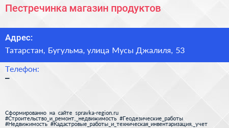 Пестречинка, магазин продуктов по адресу Татарстан, Бугульма, улица Мусы Джалиля, 53 в дальнейшем Организация, размещена в следующих категориях: