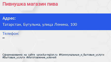 Пивнушка, магазин пива по адресу Татарстан, Бугульма, улица Ленина, 100 в дальнейшем Организация, размещена в следующих категориях: