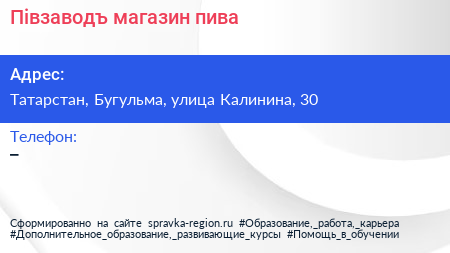 Пiвзаводъ, магазин пива по адресу Татарстан, Бугульма, улица Калинина, 30 в дальнейшем Организация, размещена в следующих категориях: