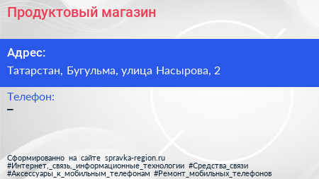 Продуктовый магазин по адресу Татарстан, Бугульма, улица Насырова, 2 в дальнейшем Организация, размещена в следующих категориях:
