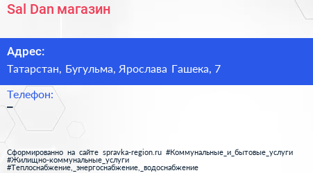 Sal Dan, магазин по адресу Татарстан, Бугульма, Ярослава Гашека, 7 в дальнейшем Организация, размещена в следующих категориях: