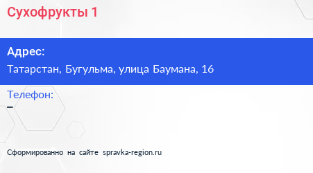 Сухофрукты №1 по адресу Татарстан, Бугульма, улица Баумана, 16 в дальнейшем Организация, размещена в следующих категориях: