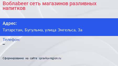 Воблаbeer, сеть магазинов разливных напитков по адресу Татарстан, Бугульма, улица Энгельса, 3а в дальнейшем Организация, размещена в следующих категориях: