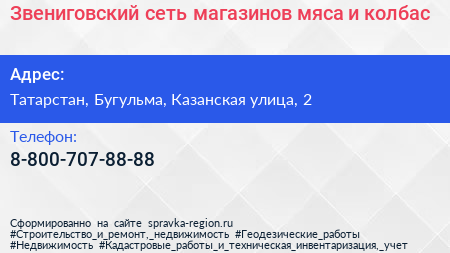 Звениговский, сеть магазинов мяса и колбас по адресу Татарстан, Бугульма, Казанская улица, 2 в дальнейшем Организация, размещена в следующих категориях: