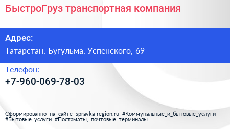 БыстроГруз, транспортная компания по адресу Татарстан, Бугульма, Успенского, 69 в дальнейшем Организация, размещена в следующих категориях: