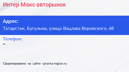 Интер-Макс, авторынок по адресу Татарстан, Бугульма, улица Вацлава Воровского, 68 в дальнейшем Организация, размещена в следующих категориях:
