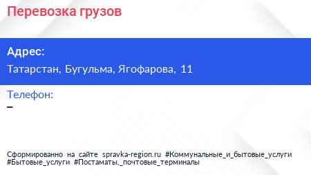 Перевозка грузов по адресу Татарстан, Бугульма, Ягофарова, 11 в дальнейшем Организация, размещена в следующих категориях: