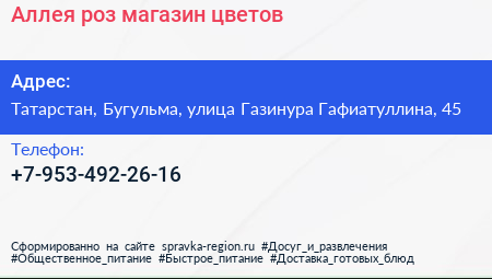 Аллея роз, магазин цветов по адресу Татарстан, Бугульма, улица Газинура Гафиатуллина, 45 в дальнейшем Организация, размещена в следующих категориях: