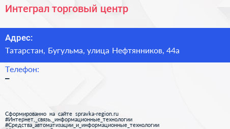 Интеграл, торговый центр по адресу Татарстан, Бугульма, улица Нефтянников, 44а в дальнейшем Организация, размещена в следующих категориях: