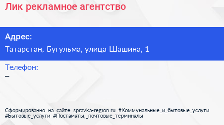 Лик, рекламное агентство по адресу Татарстан, Бугульма, улица Шашина, 1 в дальнейшем Организация, размещена в следующих категориях: