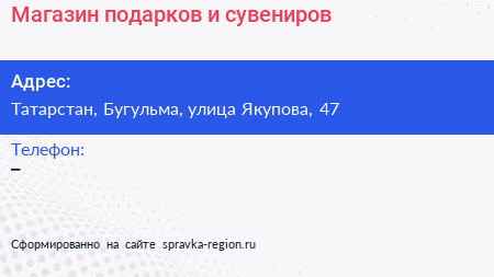 Магазин подарков и сувениров по адресу Татарстан, Бугульма, улица Якупова, 47 в дальнейшем Организация, размещена в следующих категориях: