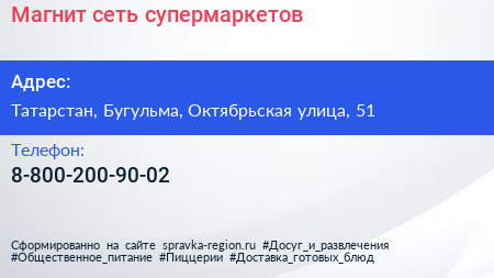 Магнит, сеть супермаркетов по адресу Татарстан, Бугульма, Октябрьская улица, 51 в дальнейшем Организация, размещена в следующих категориях: