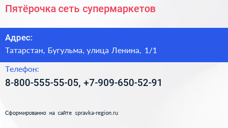 Пятёрочка, сеть супермаркетов по адресу Татарстан, Бугульма, улица Ленина, 1/1 в дальнейшем Организация, размещена в следующих категориях: