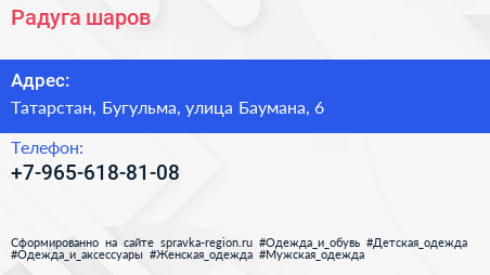 Радуга шаров по адресу Татарстан, Бугульма, улица Баумана, 6 в дальнейшем Организация, размещена в следующих категориях: