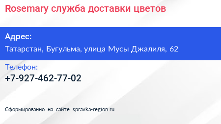 Rosemary, служба доставки цветов по адресу Татарстан, Бугульма, улица Мусы Джалиля, 62 в дальнейшем Организация, размещена в следующих категориях: