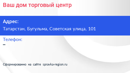 Ваш дом, торговый центр по адресу Татарстан, Бугульма, Советская улица, 101 в дальнейшем Организация, размещена в следующих категориях: