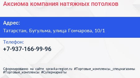 Аксиома, компания натяжных потолков по адресу Татарстан, Бугульма, улица Гончарова, 10/1 в дальнейшем Организация, размещена в следующих категориях: