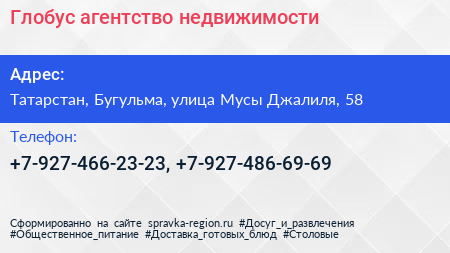 Глобус, агентство недвижимости по адресу Татарстан, Бугульма, улица Мусы Джалиля, 58 в дальнейшем Организация, размещена в следующих категориях: