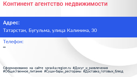 Континент, агентство недвижимости по адресу Татарстан, Бугульма, улица Калинина, 30 в дальнейшем Организация, размещена в следующих категориях: