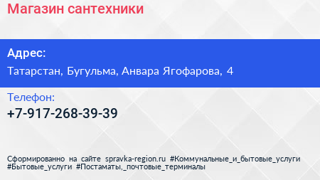 Магазин сантехники по адресу Татарстан, Бугульма, Анвара Ягофарова, 4 в дальнейшем Организация, размещена в следующих категориях: