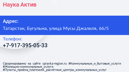 Наука-Актив по адресу Татарстан, Бугульма, улица Мусы Джалиля, 66/5 в дальнейшем Организация, размещена в следующих категориях: