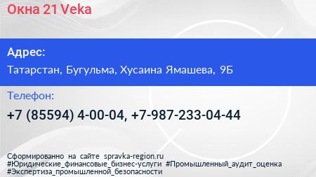 Окна 21 Veka по адресу Татарстан, Бугульма, Хусаина Ямашева, 9Б в дальнейшем Организация, размещена в следующих категориях: