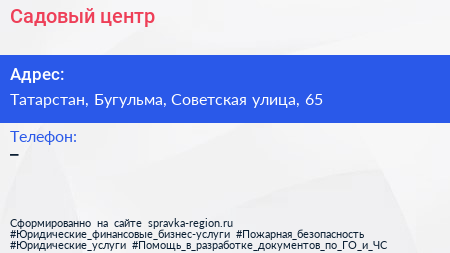 Садовый центр по адресу Татарстан, Бугульма, Советская улица, 65 в дальнейшем Организация, размещена в следующих категориях: