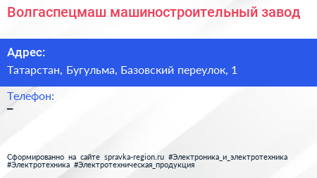 Волгаспецмаш, машиностроительный завод по адресу Татарстан, Бугульма, Базовский переулок, 1 в дальнейшем Организация, размещена в следующих категориях:
