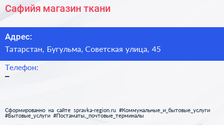 Сафийя, магазин ткани по адресу Татарстан, Бугульма, Советская улица, 45 в дальнейшем Организация, размещена в следующих категориях: