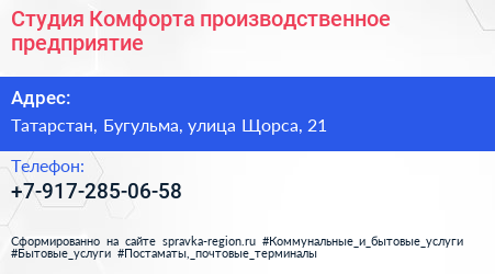 Студия Комфорта, производственное предприятие по адресу Татарстан, Бугульма, улица Щорса, 21 в дальнейшем Организация, размещена в следующих категориях: