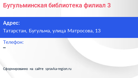 Бугульминская библиотека, филиал №3 по адресу Татарстан, Бугульма, улица Матросова, 13 в дальнейшем Организация, размещена в следующих категориях: