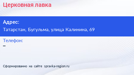 Церковная лавка по адресу Татарстан, Бугульма, улица Калинина, 69 в дальнейшем Организация, размещена в следующих категориях: