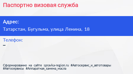 Паспортно-визовая служба по адресу Татарстан, Бугульма, улица Ленина, 18 в дальнейшем Организация, размещена в следующих категориях: