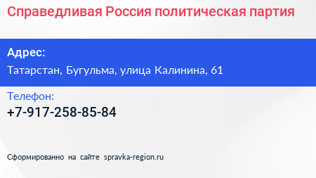 Справедливая Россия, политическая партия по адресу Татарстан, Бугульма, улица Калинина, 61 в дальнейшем Организация, размещена в следующих категориях: