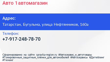 Авто №1, автомагазин по адресу Татарстан, Бугульма, улица Нефтянников, 160а в дальнейшем Организация, размещена в следующих категориях: