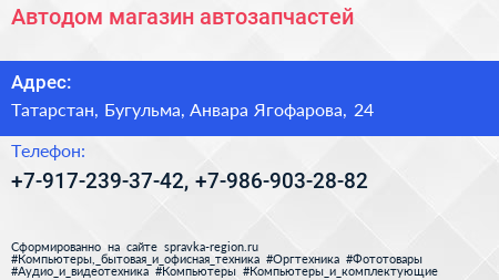 Автодом, магазин автозапчастей по адресу Татарстан, Бугульма, Анвара Ягофарова, 24 в дальнейшем Организация, размещена в следующих категориях: