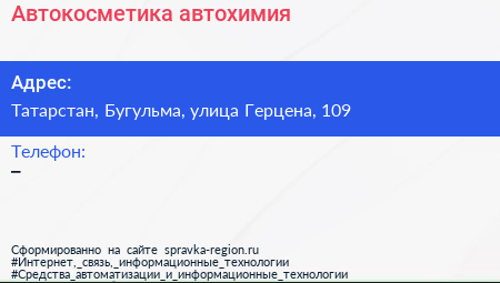 Автокосметика, автохимия по адресу Татарстан, Бугульма, улица Герцена, 109 в дальнейшем Организация, размещена в следующих категориях: